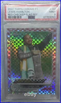 The product is a 2022 Topps Chrome Formula 1 trading card featuring Lewis Hamilton, the Grand Prix winner with a checker flag design. This officially licensed card is graded as a 9 by Professional Sports Authenticator (PSA) and is part of the Topps Chrome set for the 2022 season.